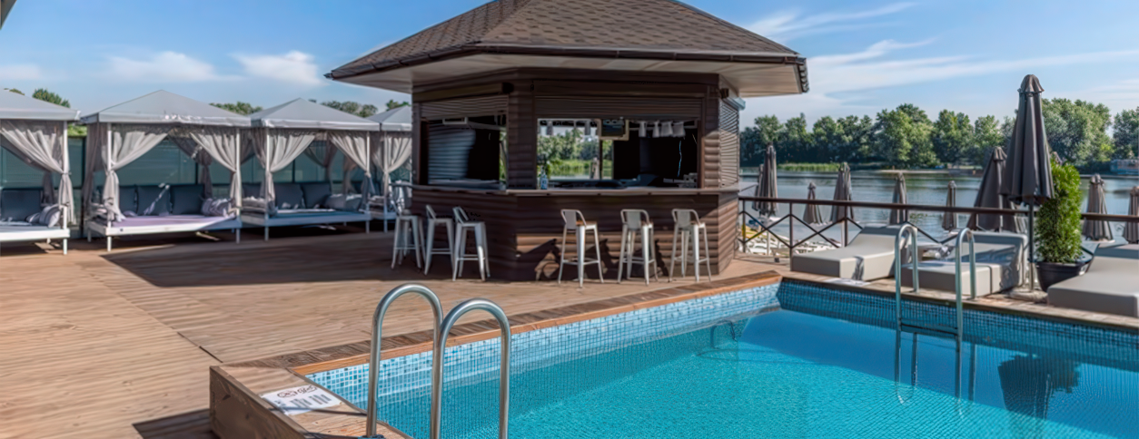 Бассейн интегрирован в пляжную зону комплекса и органично дополняет ресторанную инфраструктуру на воде.