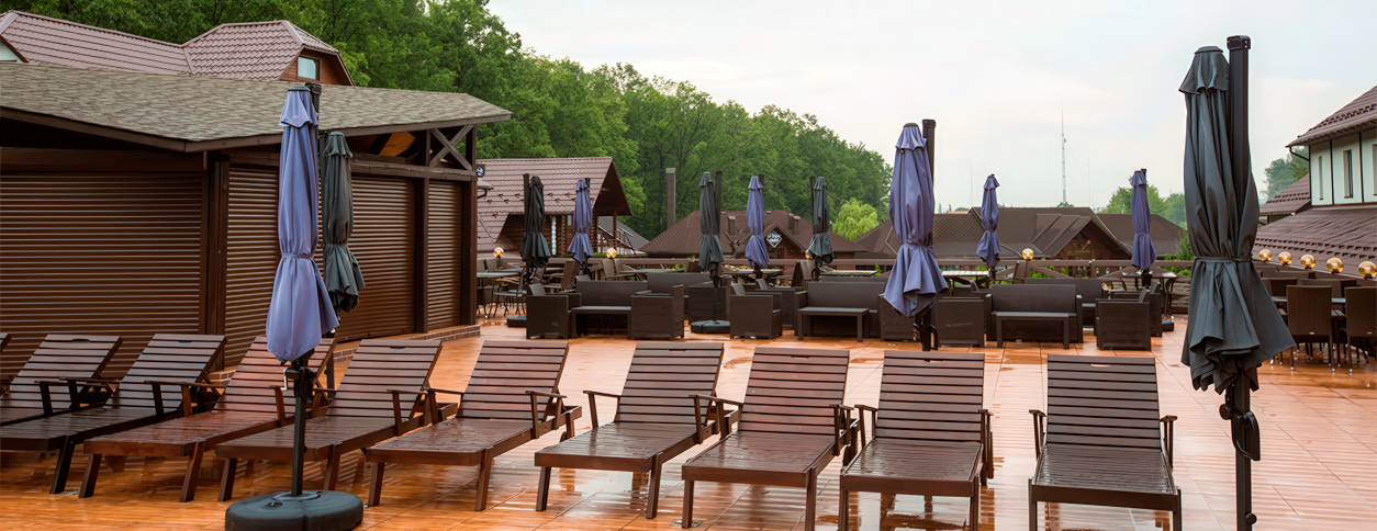 Пространство вокруг бассейна организовано так, чтобы гости могли комфортно отдыхать и проводить время на свежем воздухе.
