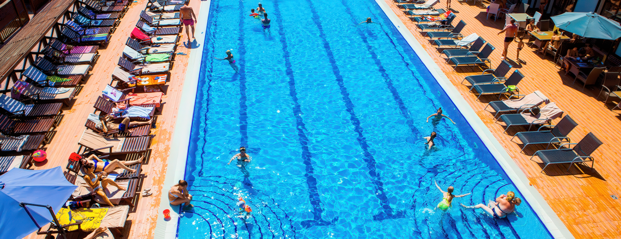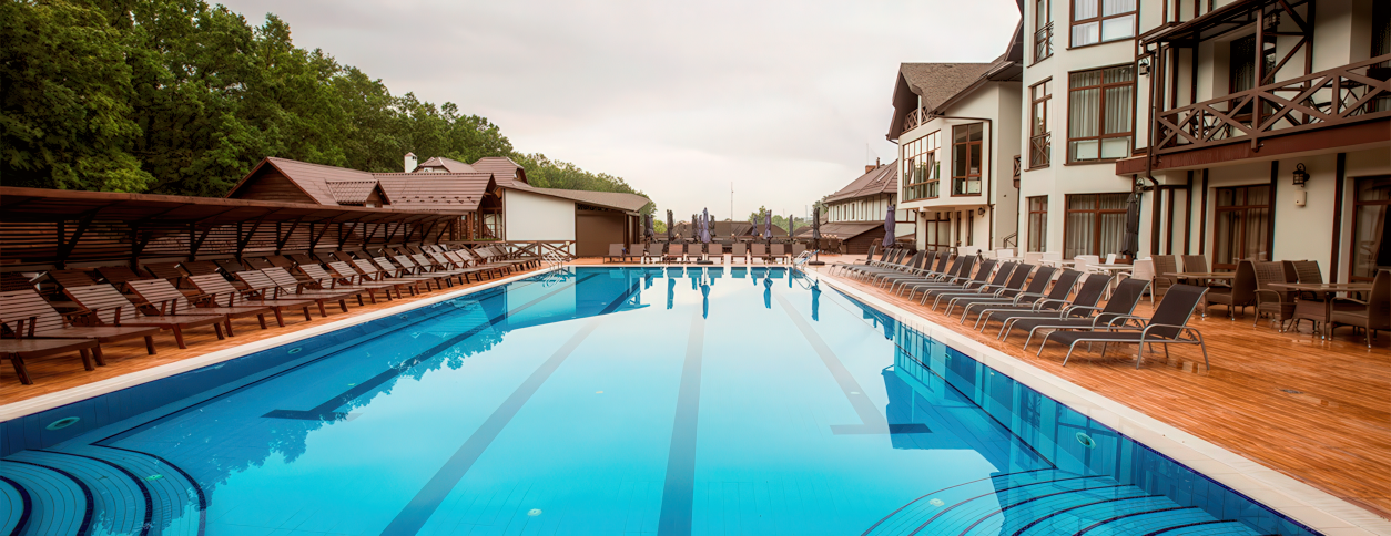Бассейн заполнен пресной водой и рассчитан на спокойный формат использования без спортивных дорожек.