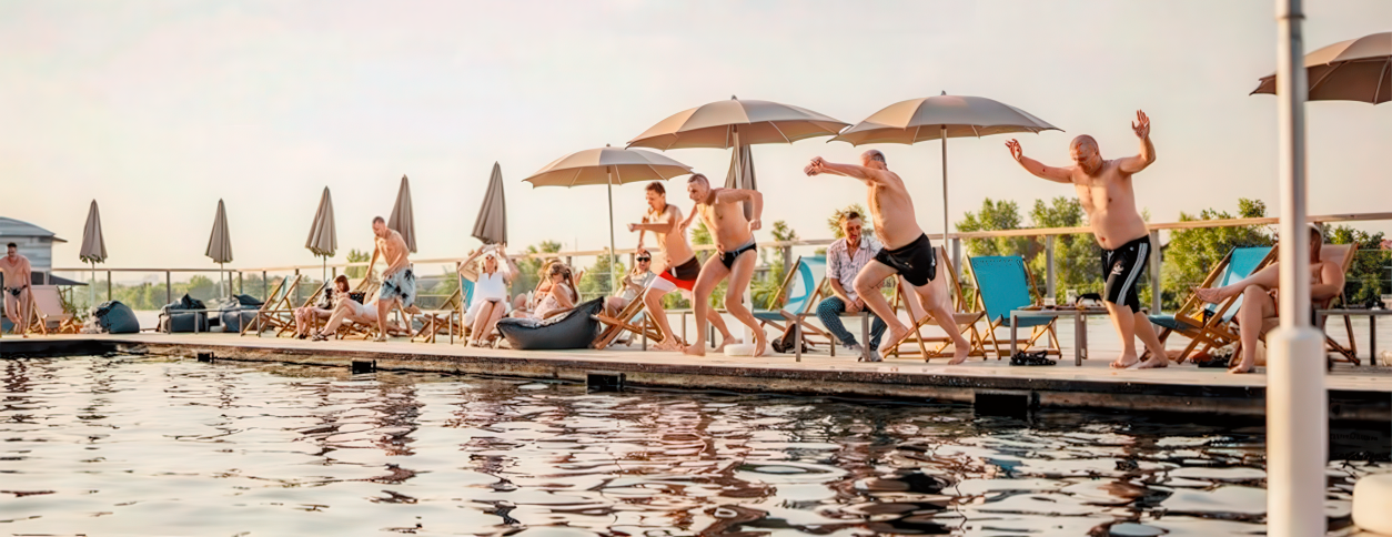 Пляжный клуб Маячок на Жуковском острове в Киеве — это открытый формат пляжного бассейна, ориентированный на летний отдых и атмосферу курортного клуба. Он входит в состав пляжного клуба Маячок, который находится на Жуковском острове в Киеве и известен своей природной локацией у воды. Пространство создавалось как место для расслабленного досуга, дневного отдыха и встреч с друзьями. Формат бассейна больше курортный, чем спортивный, с акцентом на комфорт и отдых на свежем воздухе.