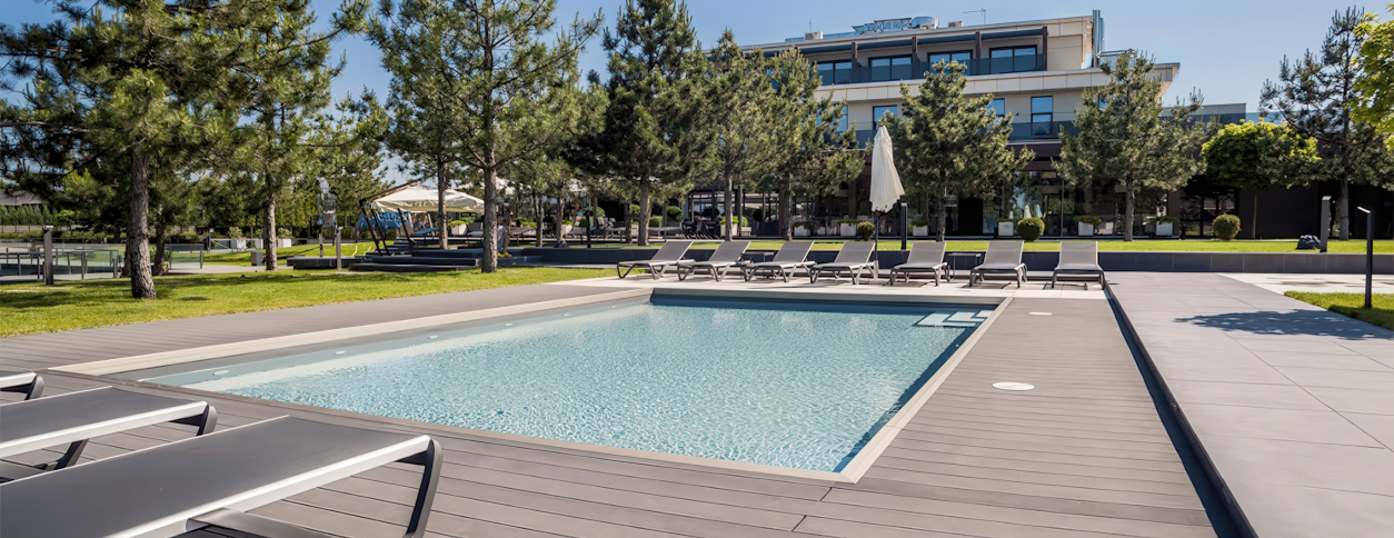 Бассейновая зона входит в состав крупного комплекса отдыха и включает взрослый и детский бассейны, предназначенные для свободного плавания и релакса.