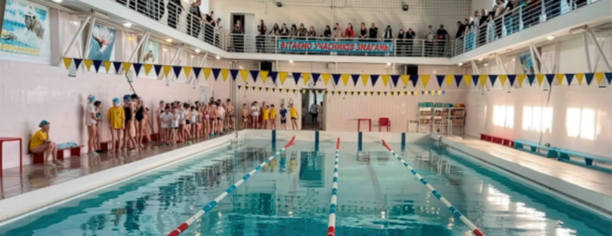 Бассейн Дворца детей и юношества в Виннице разделен на 4 широких дорожки и оснащен стартовыми тумбами.