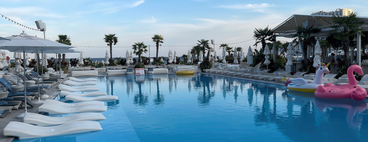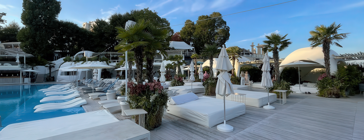 Для комфортного отдыха у бассейна Ибица Вы можете арендовать обычный шезлонг, VIP шезлонг и шатер на несколько человек.