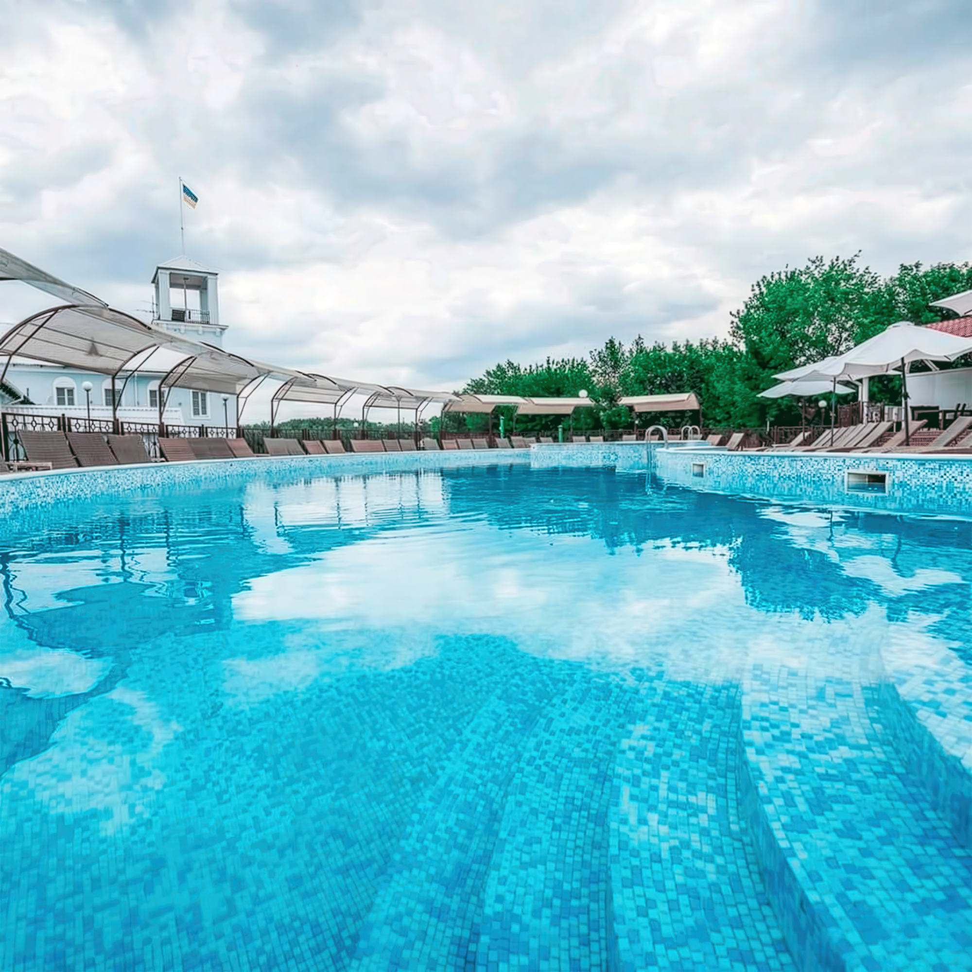 Комплекс Труханов в Киеве оборудовал для своих гостей два просторных бассейна с шезлонгами, столиками и небольшой водной горкой. Вода в ваннах чистая, регулярно очищается и фильтруется. Средняя температура составляет 28-29°C.