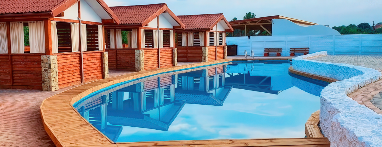 Ресторан Виктория в Виннице готов порадовать своих посетителей не только вкусной кухней, но и просторным открытым бассейном с джакузи и ночной донной подсветкой. Вокруг ванны очень уютно: здесь есть несколько альтанок, деревянные лежаки, пальмы и зонтики. Вода всегда прозрачная, очищается современной системой фильтрации. Температура сохраняется на уровне 28-30°C.